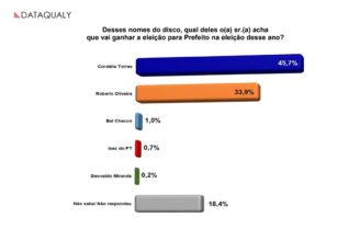 Confrontados com a pergunta sobre qual dos cinco candidatos ganhará a eleição, 45,7% responderam com o nome de Córdelia, enquanto 33,9%, com o do prefeito Robério Oliveira (PSD), candidato à reeleição. Bel Chacon foi apontado por 1%, Isac do PT, por 0,7%, e Geovaldo Miranda, 0,2%.