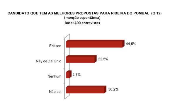 O candidato do PSD é também aquele cujas propostas para a cidade são consideradas as melhores para 44,5% dos entrevistados. Nay aparece com as melhores proposições para 22,5%. Nenhum são 2,7% e Não sei, 30,2%.