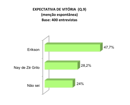 47,7% acham que ele vence a eleição em 15 de novembro, ao passo que 28,2% esperam que a vitoriosa seja Nay de Zé Grilo, candidata do PP. Não sabem quem vai ganhar são 24%.