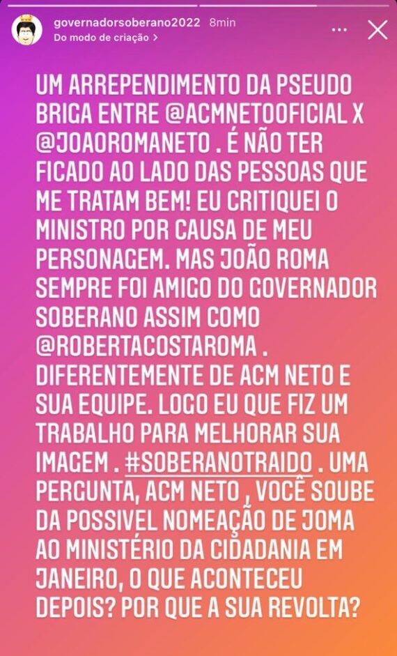 "Arrependimento é não ter ficado ao lado das pessoas que me tratam bem. Eu critiquei o ministro por causa do meu personagem, mas João Roma sempre foi amigo do Governador Soberano, assim como Roberta Roma", escreveu.
