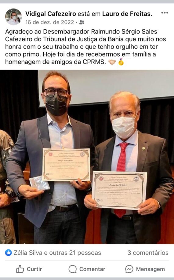 A prefeita de Lauro de Freitas, Moema Gramacho (PT), deve lançar seu vice, Vidigal Cafezeiro (Republicanos), como candidato à sucessão em 2024. O detalhe é que o número dois da gestão municipal é primo do desembargador Raimundo Sérgio Sales Cafezeiro, relator, na Justiça Eleitoral, da ação movida pelo diretório local do PSB que resultou na cassação da vereadora Débora Regis (PDT), principal candidata da oposição à sucessão de Moema no ano que vem.