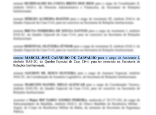 A nomeação de Carvalho foi publicada no Diário Oficial do último dia 24 de maio, para o cargo de Assistente I, símbolo DAS-2C, do quadro especial da Casa Civil, mas para exercer função na Secretaria de Relações Institucionais (Serin), que concentra toda a articulação política do governo.