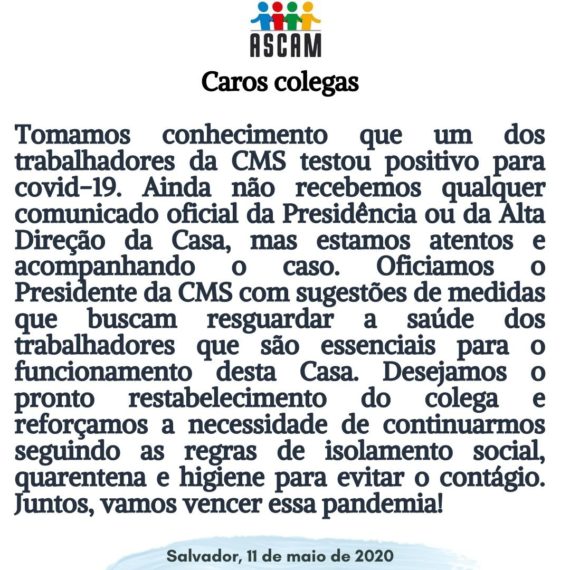 “Oficiamos o Presidente da CMS com sugestões de medidas que buscam resguardar a saúde dos trabalhadores que são essenciais para o funcionamento desta Casa”, acrescentou o comunicado.