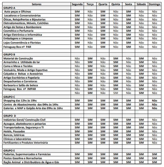 Pelo texto, os estabelecimentos com até 200 m² poderão abrir entre às 9h e 16h, mas em dias específicos a depender do setor. Nas segundas, quartas e sextas-feiras, estão autorizadas a funcionar, por exemplo: óticas, locadoras, concessionárias, lojas de conveniência, floristas e outros. Nas terças, quintas e sábados, funcionam: material de construção, barbeira, salão de beleza e outros.