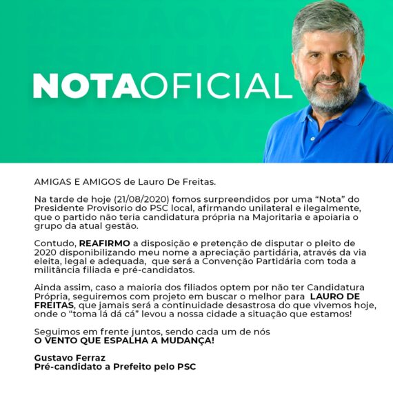 Determinado a apoiar a reeleição da prefeita Moema Gramacho (PT) em Lauro de Freitas, o diretório do PSC no município deu uma rasteira no ex-diretor da Defesa Civil de Salvador (Codesal), Gustavo Ferraz, que havia se lançado como pré-candidato à Prefeitura.