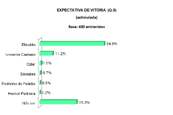 A pesquisa P&A/Política Livre também avaliou a expectativa de vitória na sucessão municipal em Camaçari. À pergunta "Se as eleições para prefeito fossem hoje, quem você acha que seria eleito?" 54,5% responderam (achar) que quem ganha a eleição é o atual prefeito, Elinaldo Araújo (DEM). Já 11,2% acreditam que Ivoneide Caetano, candidata do PT, deve vencer a disputa. Os demais candidatos pesquisados foram citados por 1% ou menos. (Cravaram em Oziel 1,5%, em Sócrates 0,7%, em Pedrinho de Pedrão, 0,5% e em Heckel Pedreira, 0,2%). 31,3% não sabem quem deve ganhar a eleição em Camaçari. O levantamento, registrado no Tribunal Regional Eleitoral (TRE) sob o número BA-00911/2020, foi realizado com 400 pessoas nos dias 10 e 11 de setembro de 2020, no domicílio do entrevistado, tem uma margem de erro de 5,0 pontos percentuais para mais ou para menos e grau de confiabilidade de 95,5%.