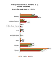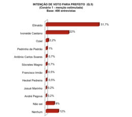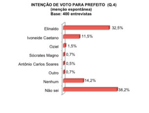 Na sondagem espontânea, o favoritismo de Elinaldo também se confirma, com 32,5% das intenções de voto. Ivoneide aparece com 11,5% e Oziel, com 1,5%. Em relação ao primeiro levantamento, de julho, o prefeito também registra crescimento significativo. Naquele momento, aparecia com 21,6%, já Ivoneide registrava 4,6% e Oziel, 0,7%.
