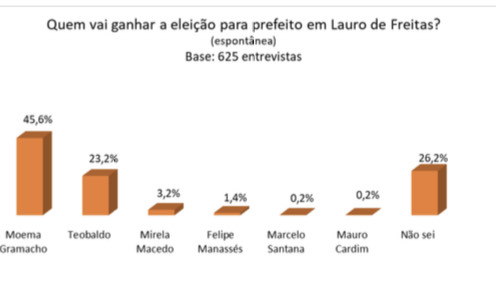 Registrada na Justiça Eleitoral sob o número BA-06704/2020, a pesquisa foi realizada nos dias 9 e 10 de novembro com 625 pessoas no município de Lauro de Freitas, na região metropolitana.