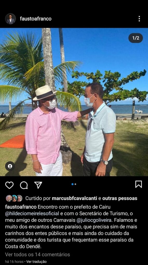 O titular da Setur apareceu ao lado do prefeito de Cairu, Hildécio Meirelles. A pauta? Uma discussão relevante. “Falamos sobre os encantos desse paraíso”, segundo as palavras do próprio Franco também nas redes sociais.