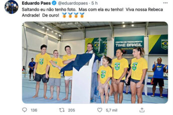 O post foi feito em comemoração ao ouro da ginasta Rebeca Andrade na disputa do salto, neste domingo (1º). "Saltando eu não tenho foto. Mas com ela eu tenho! Viva nossa Rebeca Andrade! De ouro!", escreveu Eduardo Paes na publicação.