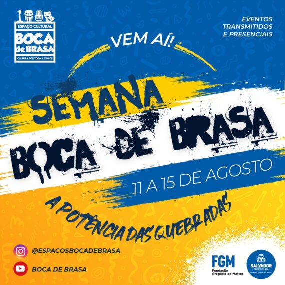 A produção cultural das periferias de Salvador tem uma força e uma diversidade que é reconhecida em todo o mundo. Por tamanha riqueza, a Prefeitura – através da Fundação Gregório de Mattos (FGM) – promove em seus espaços culturais a Semana Criativa Boca de Brasa, com o tema a Potência das Quebradas. Entre os dias 11 e 15 de agosto, uma programação virtual e presencial reúne os resultados dos projetos contemplados pelos Edital Espaços Culturais Boca de Brasa e Edital de Ocupação e Dinamização dos Espaços Culturais. O acesso do público é gratuito.