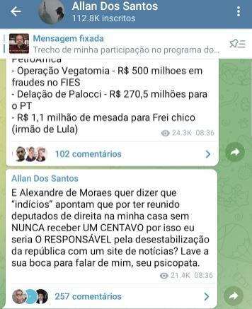 O jornalista Allan dos Santos, dono do site Terça Livre, em uma postagem realizada no domingo (17) em uma lista de transmissão que possui no aplicativo Telegram, chamou o ministro do Supremo Tribunal Federal (STF), Alexandre de Moraes, de "psicopata". Allan dos Santos, que é um dos investigados na CPMI das Fake News e responde a inquéritos no STF, reclamou de uma suposta declaração do ministro que o apontava como responsável pela "desestabilização da República". O blogueiro reside nos EUA.