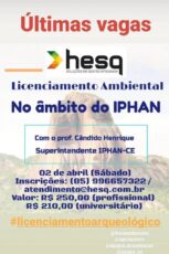 O superintendente do Iphan (Instituto do Patrimônio Histórico e Artístico Nacional) do Ceará, Cândido Henrique de Aguiar Bezerra, vai oferecer o curso "Licenciamento Ambiental no Âmbito do Iphan" em uma empresa de consultoria chamada Hesq.
