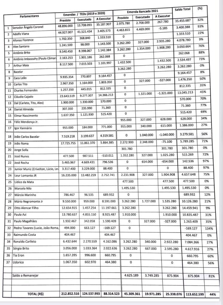 No total, os parlamentares baianos somam R$ 212,8 milhões em recursos nesse período, o que levantou questionamentos nos colegas sobre o motivo pelo qual eles estão sendo privilegiados em detrimento dos demais nas destinações de recursos do Orçamento da União.