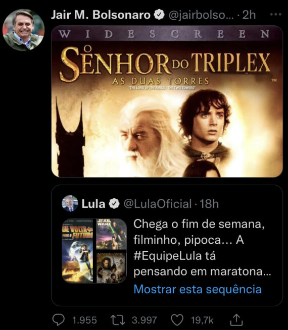 No Twitter, o chefe do Palácio do Planalto compartilhou uma publicação do petista para ressuscitar o caso do triplex do Guarujá por meio de um meme do filme "O Senhor dos Anéis", em que a última palavra foi trocada por "triplex".