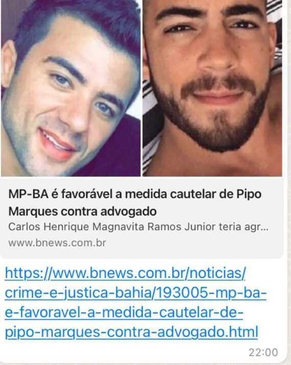 O motivo, também relata uma das publicações, seriam ciúmes de uma cantora de Axé que fora sua namorada. Uma quarta reportagem noticia que o Ministério Público baiano, depois da alegada agressão a Pipo, resolveu se posicionar a favor de uma medida protetiva contra o advogado, solicitada à Justiça pelo filho de Bell.