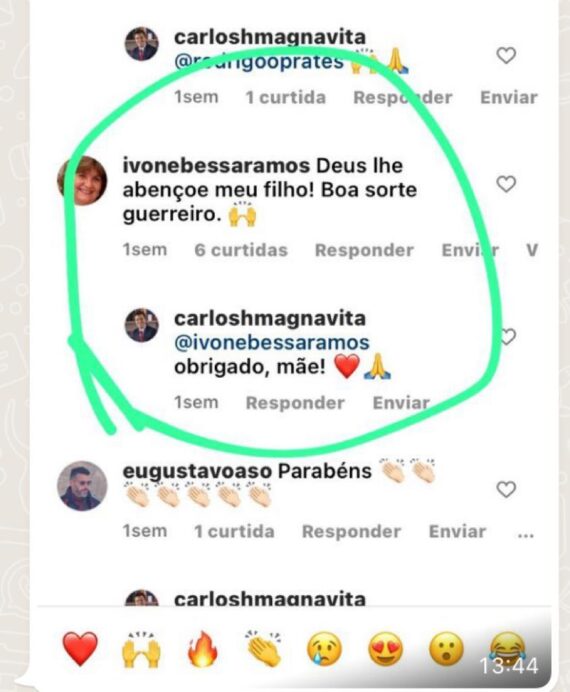 "Deus lhe abençoe meu filho. Boa Sorte guerreiro", folgou a desembargadora Ivone Bessa, ao que o criminalista retrucou na mesma página, seguido de uma figura com um coração e outra de Graças a Deus: 'obrigado, mãe'!