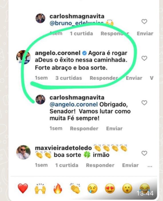 Ele atribui muito mais a um suposto prestígio da magistrada do que ao do próprio candidato pelo menos uma manifestação de apoio de um político a ele em seguida à postagem. "Agora é rogar a Deus o êxito nesta caminhada. Forte abraço e boa sorte", escreveu o senador Angelo Coronel (PSD).