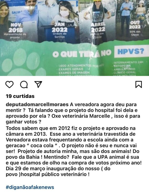 "A vereadora agora deu para mentir? Tá falando que o projeto do hospital foi dela e aprovado por ela? Oxe, veterinária Marcelle, isso é para ganhar votos? Todos sabem que em 2012 a veterinária travestida de vereadora estava frequentando a escola ainda com a geração 'coca-cola'", atacou Marcell.