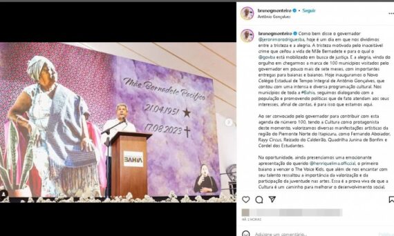 Na foto, o governador Jerônimo Rodrigues, do PT, estava diante de um painel com o rosto da ialorixá, e o secretário lamentou o crime enquanto mencionava as realizações do governo. A publicação foi posteriormente removida após a repercussão negativa.