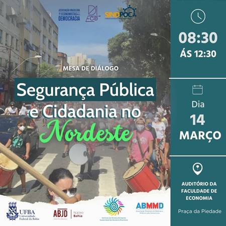 'Segurança Pública e Cidadania no Nordeste' é o tema de uma mesa de diálogo que reúne, na quinta-feira (14), representantes dos governos federal e estadual, da academia e da sociedade civil. Promovido pela ONG Instituto de Desenvolvimento Econômico Sustentável do Nordeste Brasileiro – Idene, a mesa acontece das 8h30 às 12h30, no auditório João Gonçalves, pavilhão de Aulas Reitor Felipe Serpa, campus da UFBA em Ondina.