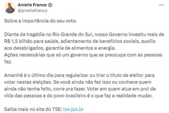 Na sequência, a ministra de Lula alertou sobre o último dia para regularizar ou tirar título de eleitor para votação nas eleições municipais deste ano. Ela, então, pediu explicitamente votos. “Votar em quem atua em prol da vida das pessoas e do povo brasileiro é o que faz a realidade melhor”, citou na publicação.