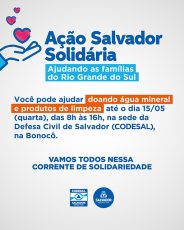 Com a ação, a capital baiana pretende unir forças para ajudar o Rio Grande do Sul, que está enfrentando sérios problemas. Apenas em Porto Alegre, de acordo com a Defesa Civil local, 9,8 mil pessoas estão acolhidas em abrigos temporários após sofrerem com as inundações.