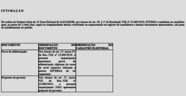 A juíza do Cartório da 19ª Zona Eleitoral de Salvador intimou o postulante ao Palácio Thomé de Souza na última quarta-feira (14) para que ele regularize a situação dentro do prazo de três dias, que encerra amanhã.
