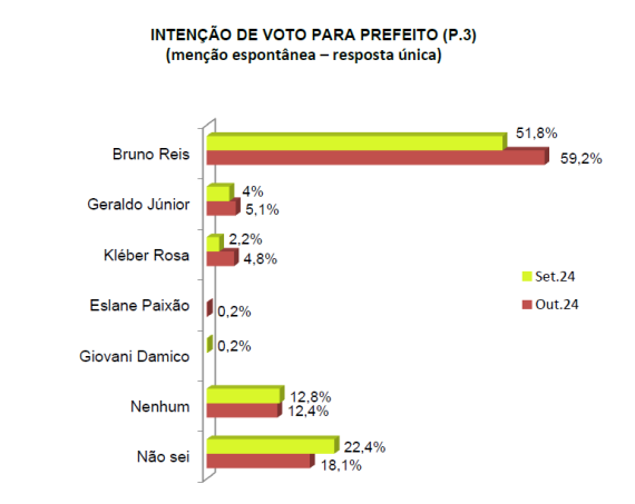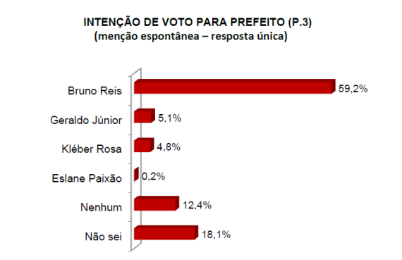 Na consulta espontânea, quando os eleitores citam livremente o nome do candidato em que pretendem votar, Bruno desponta liderando com absoluta folga, com 59,2% das intenções de voto, subindo 7,4 pontos percentuais em relação ao levantamento anterior, feito entre os dias 4 e 7 de setembro, e confirmando seu absoluto favoritismo para vencer já neste domingo. O cenário também embola para Geraldo Jr. e Kleber na medida em que o primeiro registra 5,1% e o segundo, 4,8%. Eslane Paixão tem 0,2%. Nenhum são 12,4% e Não sei, 18,1%.