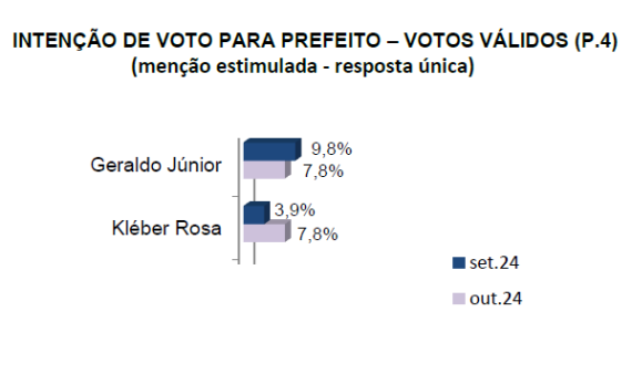 O levantamento foi registrado na Justiça Eleitoral sob o número BA-06423/2024 ouvindo 830 eleitores nos dias 2 e 4 de outubro último, tem margem de erro de 3,16 pontos percentuais, para mais ou para menos, e nível de confiança de 95,5%.