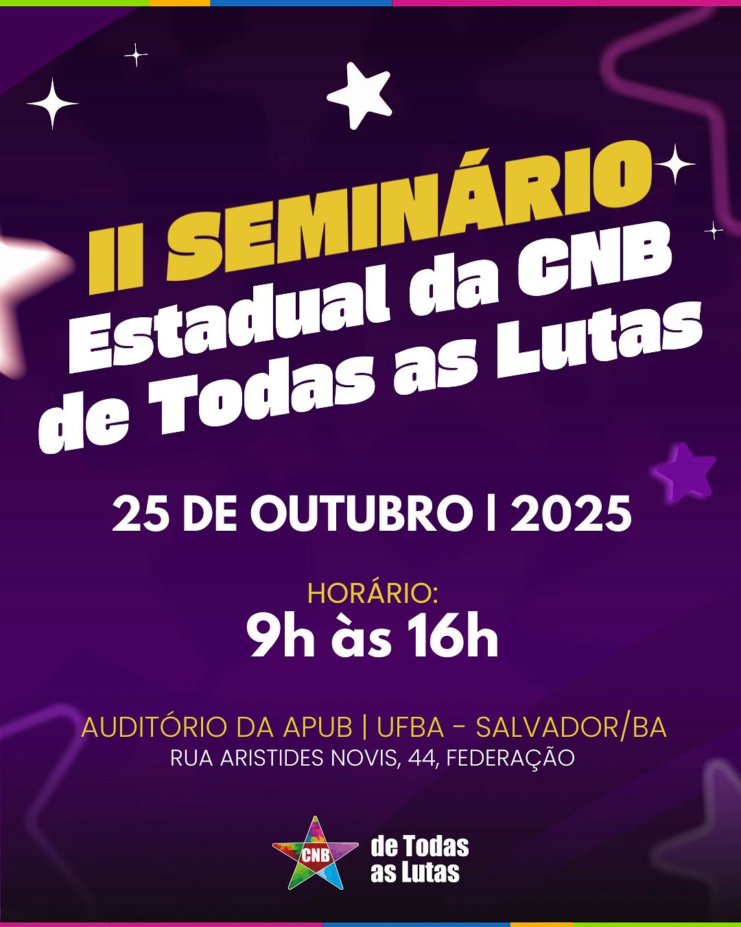 A um ano das eleições de 2026, militantes, dirigentes e intelectuais que compõem a CNB de Todas as Lutas, tendência interna do PT, começam a se movimentar. No dia 25 de outubro, das 9 às 16h, eles estarão reunidos no Auditório da APUB-UFBA (Rua Aristides Novis, 44 - Federação) para o 2º Seminário Estadual da CNB de Todas as Lutas . O encontro promete antecipar discussões que serão travadas nos próximos meses, em níveis nacional e estadual.